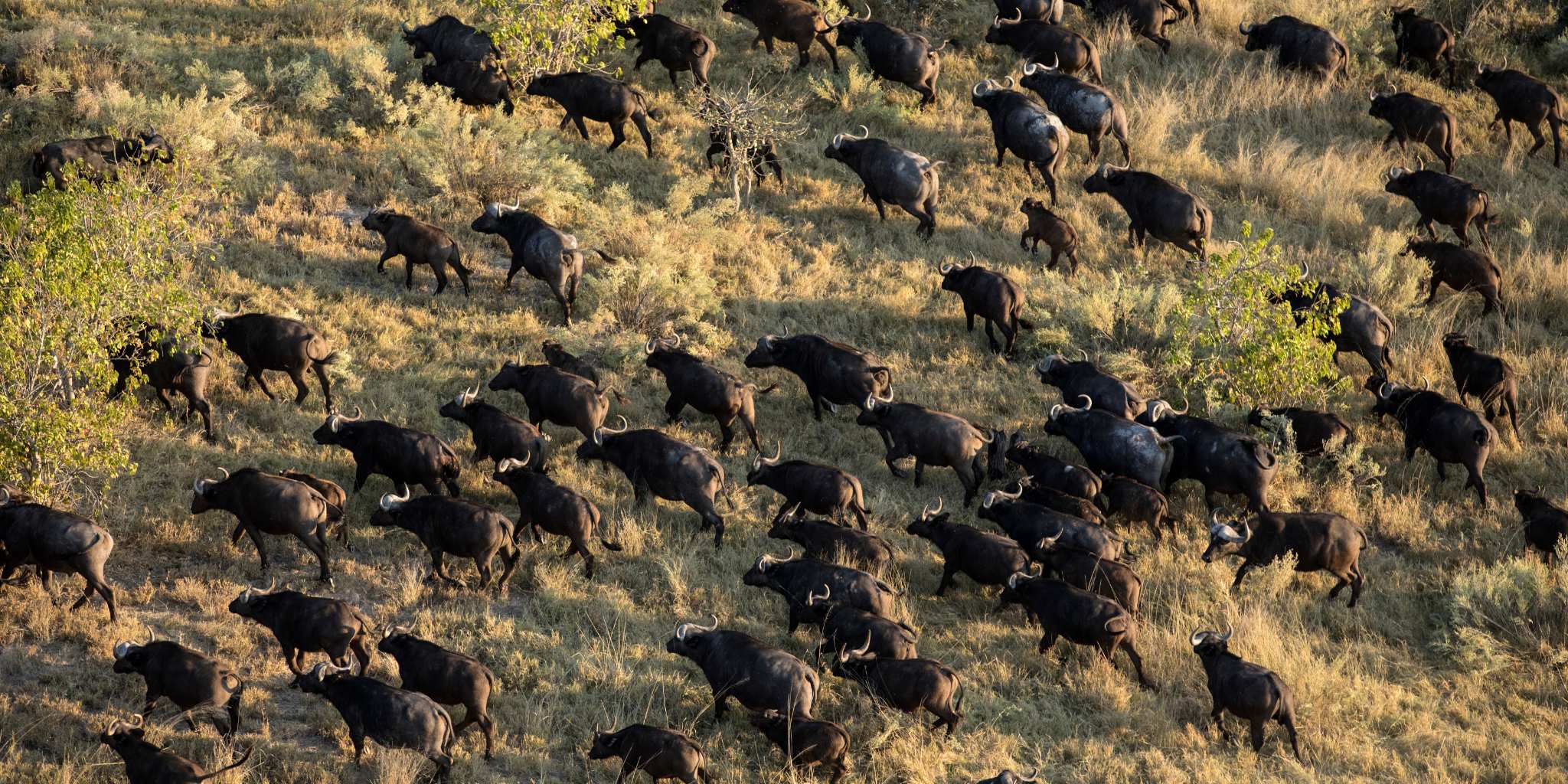 ✅ The buffalo begin to group into large herds and visit the permanent waterholes more often as the seasonal pans begin to dry