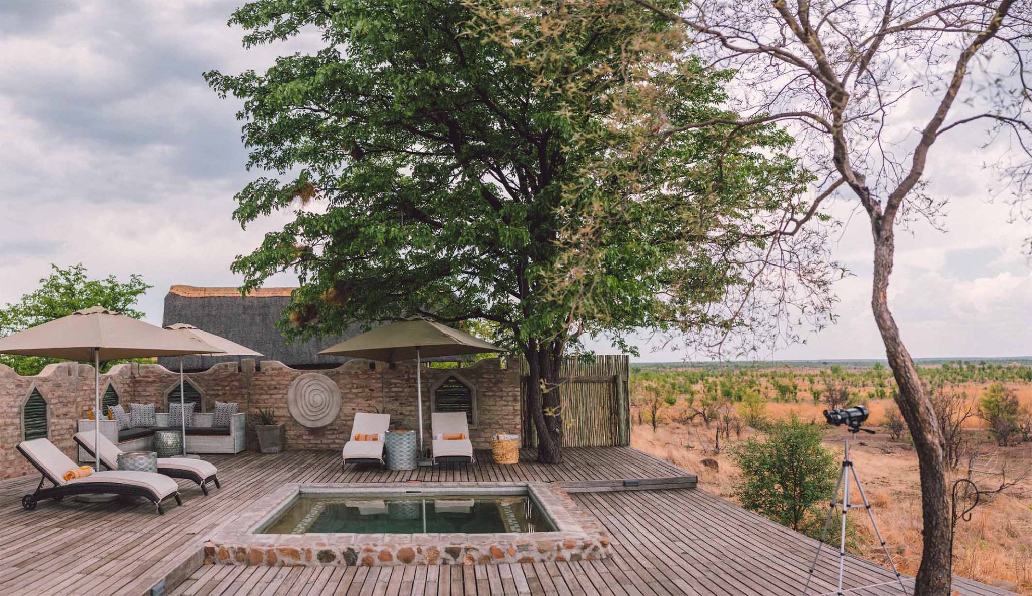 Resting on the top of the low foothills in the far north west of Hwange National Park, is Daka Plains. Probably the remotest Lodge in Hwange, this area offers guests an opportunity to walk and game drive some of the wildest areas in Southern Africa. The Lodge is situated in our own private concession in Hwange National Park so allows us the opportunity to do night drives as well. Daka Plains consists of seven units, made of thatch, local rock and canvas. Ideal for taking the whole lodge for groups, this unique place will captivate you. Big sky country is what sums up this wild area. Daka Plains overlooks the Deka floodplains and seeps which are the head waters of the Deka river.